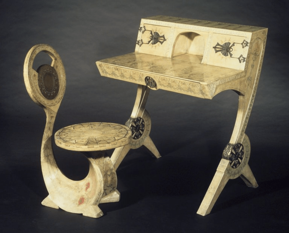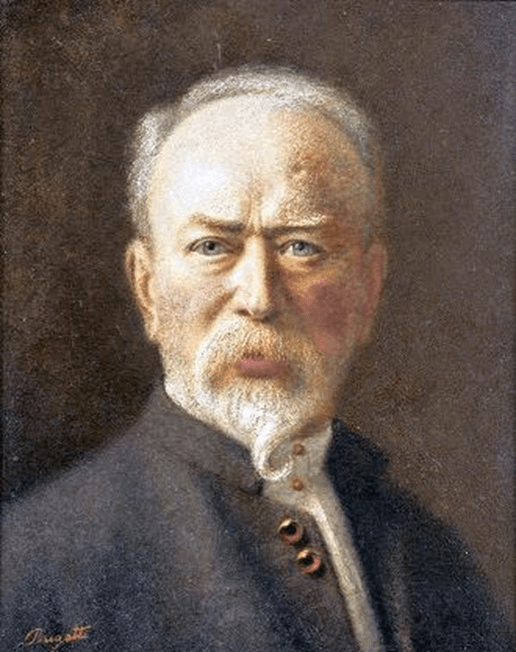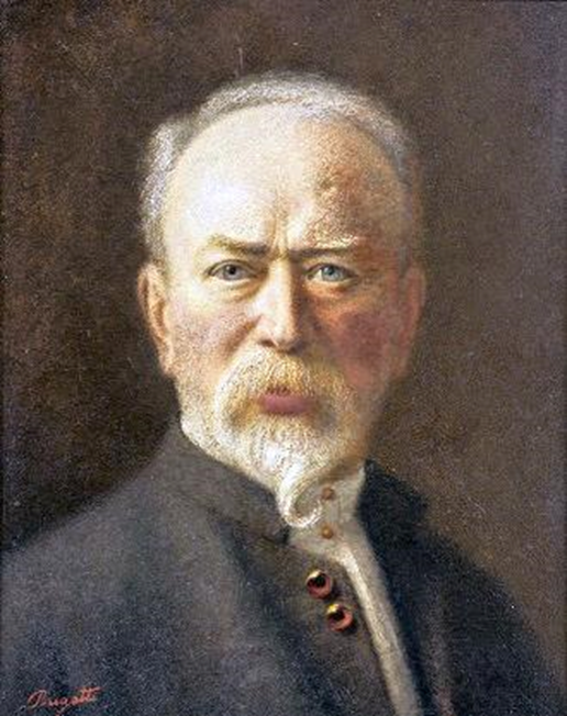 Carlo Bugatti est né à Milan en 1856 d’un père sculpteur sur bois et pierre. Il bénéficie ainsi d’une double formation, artisanale par son père et puis artistique en s’inscrivant en 1875 à l’Académie de Brera où il manifeste un intérêt particulier pour l’architecture. Son désir de mener à bien ses propres projets le conduit à acquérir la pratique de l’ébénisterie auprès de Mentasti, ébéniste milanais, jusqu’à l’ouverture de son propre atelier vers 1880. Dès 1900, Carlo Bugatti séjourne de plus en plus à Paris où il monte un atelier, et va s’intéresser davantage à la sculpture et surtout à l’orfèvrerie. Il travaille l’argent pour des services de table dans les formes pures de l’ellipse tempérées par une faune stylisée. En 1910, Bugatti s’installe à Pierrefonds (Oise), sa femme, de santé fragile, ne supportant pas l’air confiné de Paris. Carlo Bugatti meurt en 1940 en Alsace au château de Dorlisheim, domicile de son fils Ettore, le constructeur automobile.